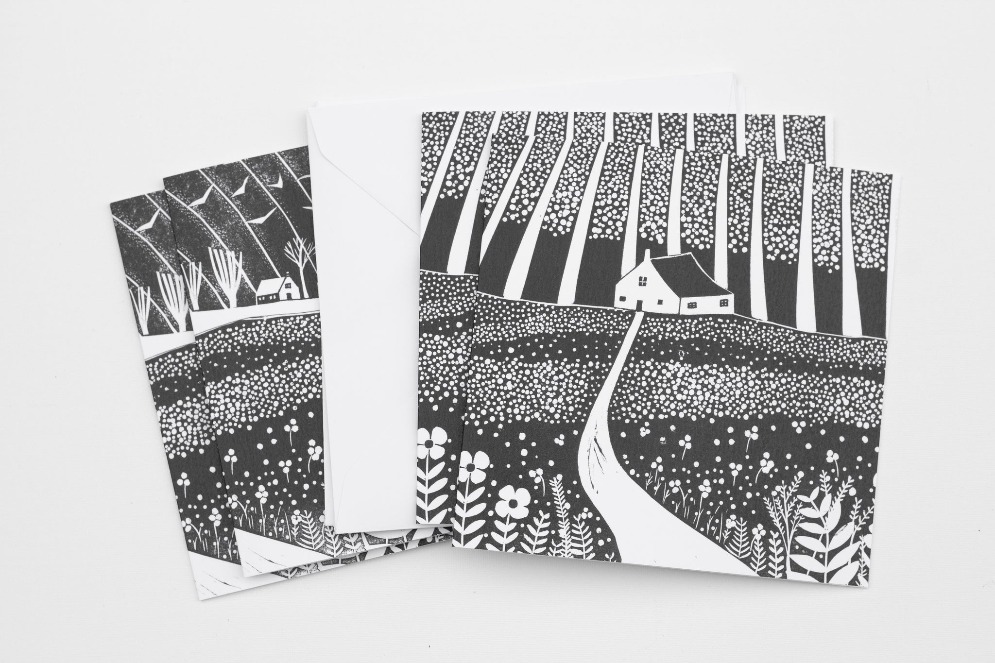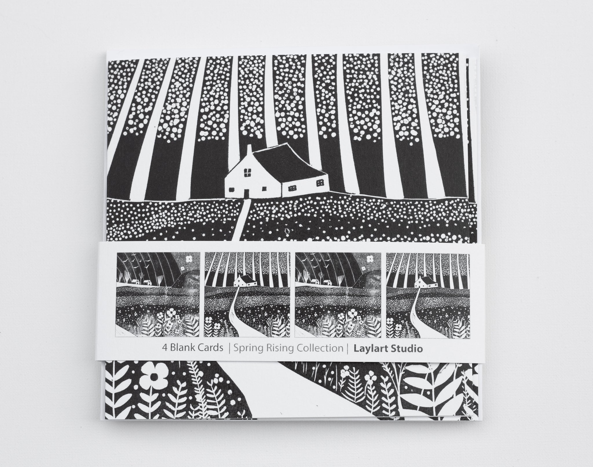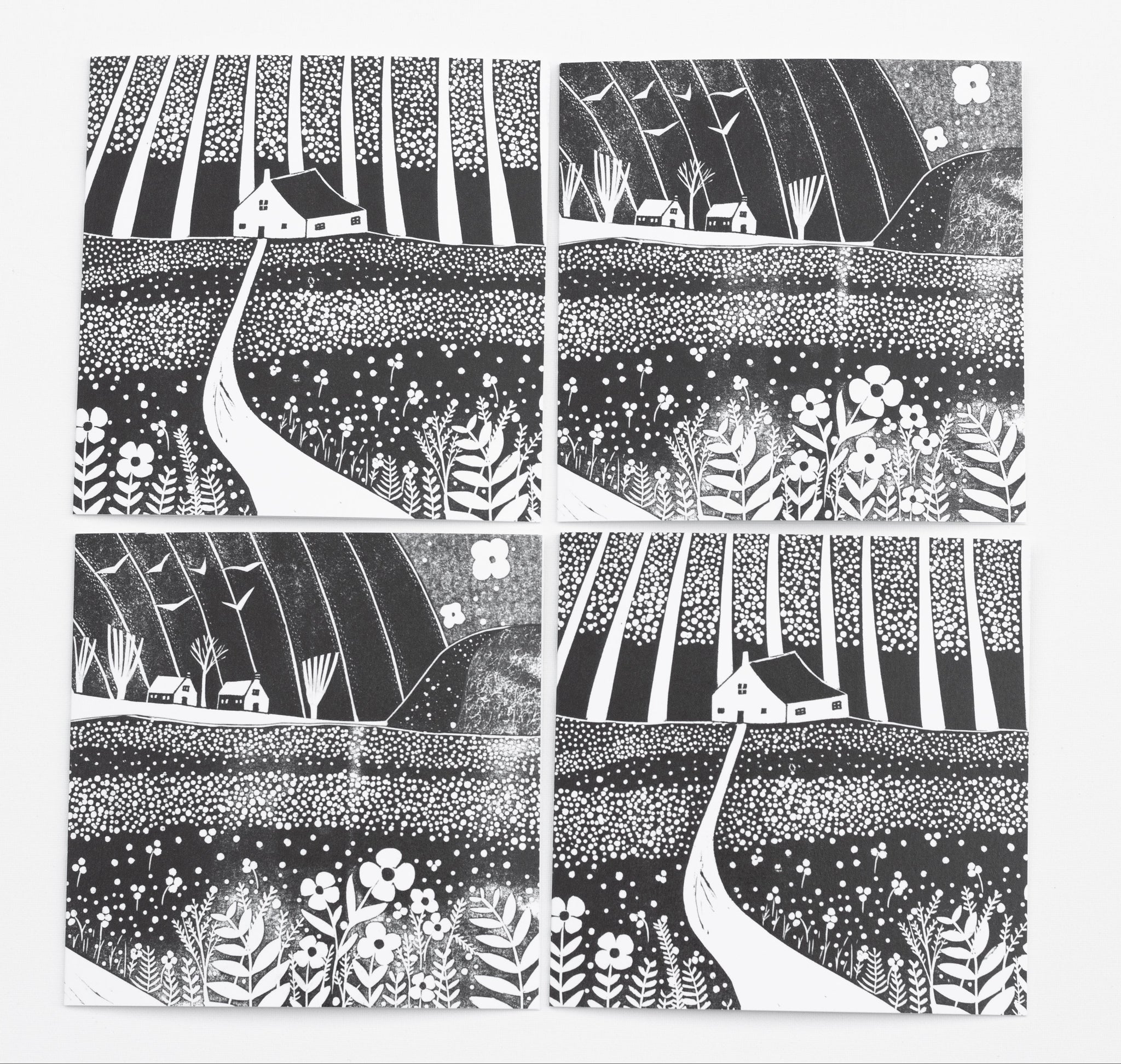 A set of four black and white art cards inspired by the fresh energy of spring. Each design is taken from my original linocut collages, featuring cottages, meadows, and new growth across the countryside. Printed on smooth, high-quality card and blank inside, they’re perfect for heartfelt notes or framing as mini prints.