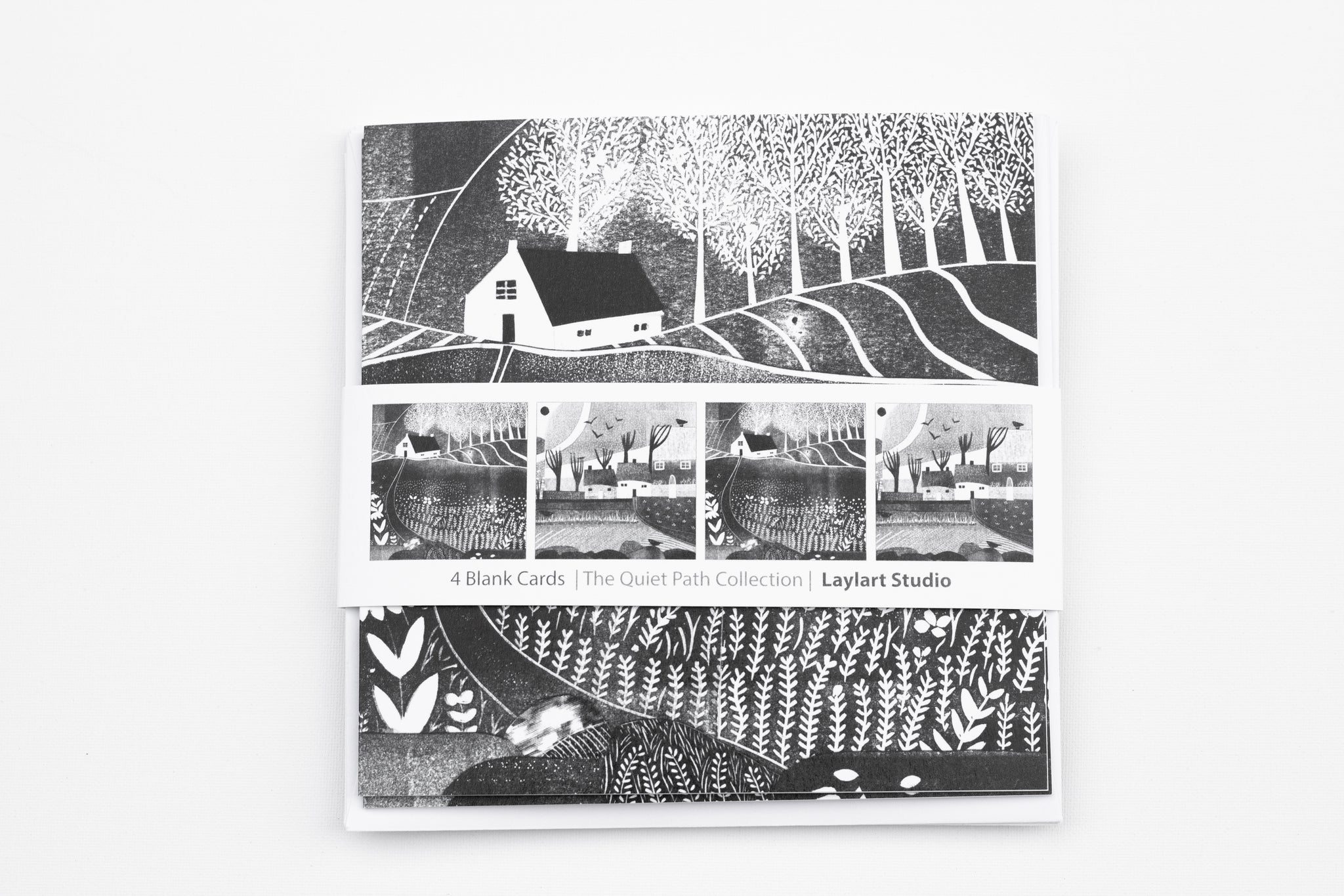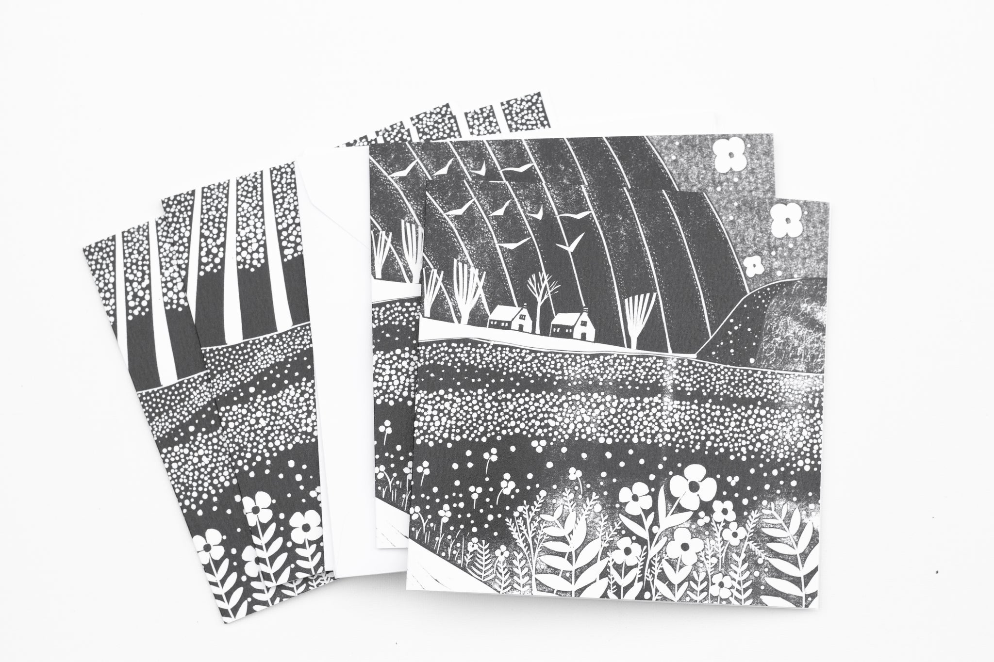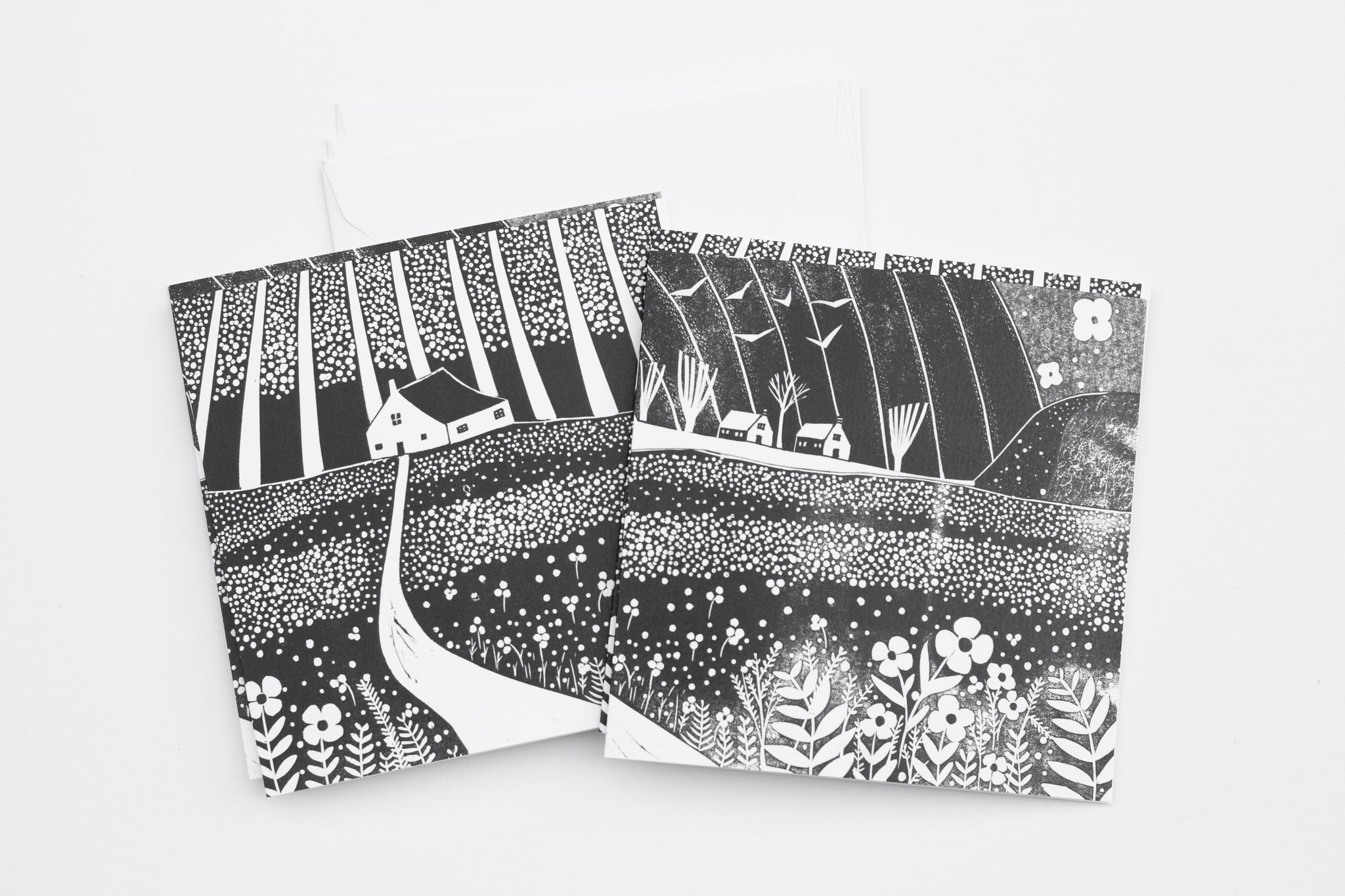 A set of four black and white art cards inspired by the fresh energy of spring. Each design is taken from my original linocut collages, featuring cottages, meadows, and new growth across the countryside. Printed on smooth, high-quality card and blank inside, they’re perfect for heartfelt notes or framing as mini prints.