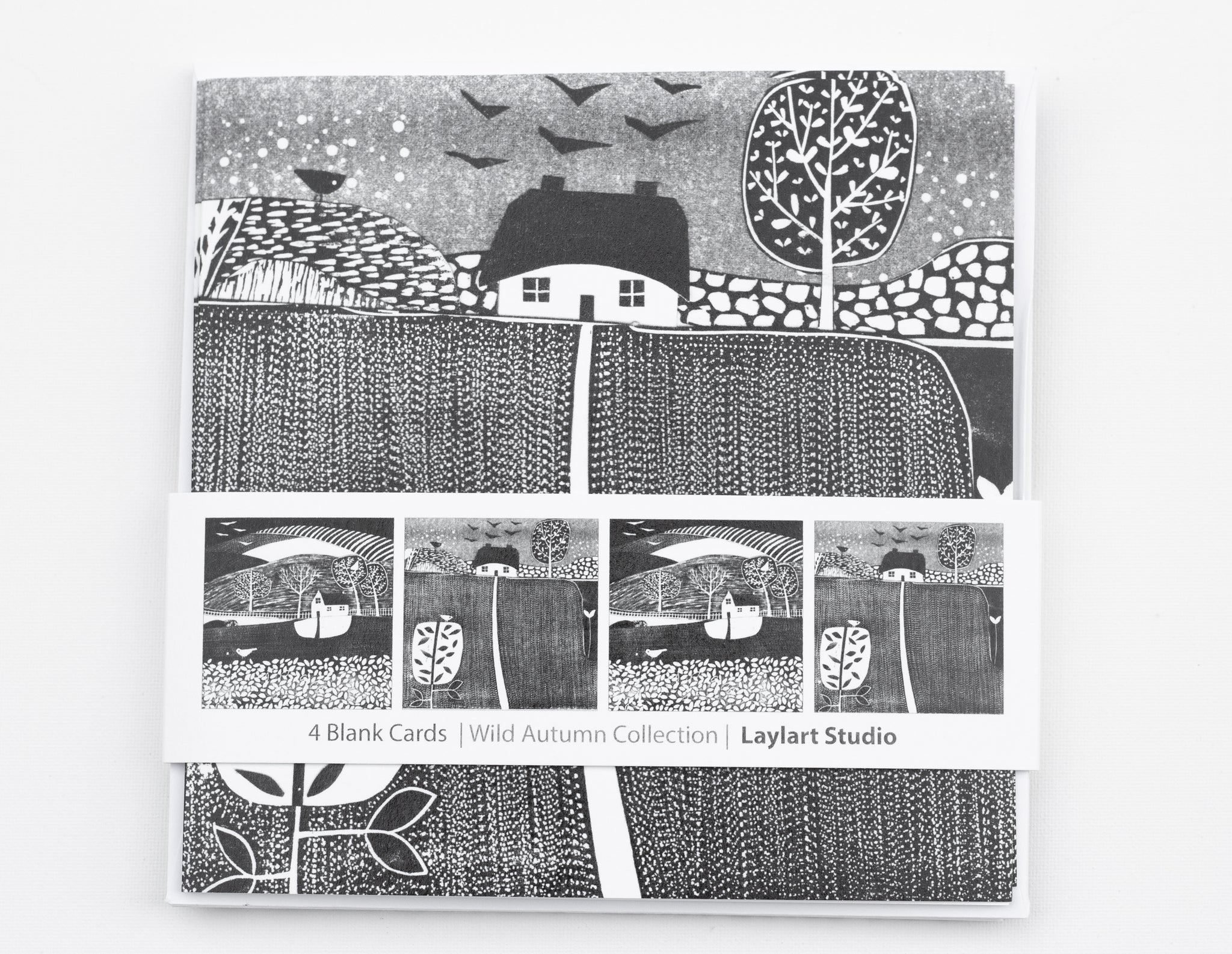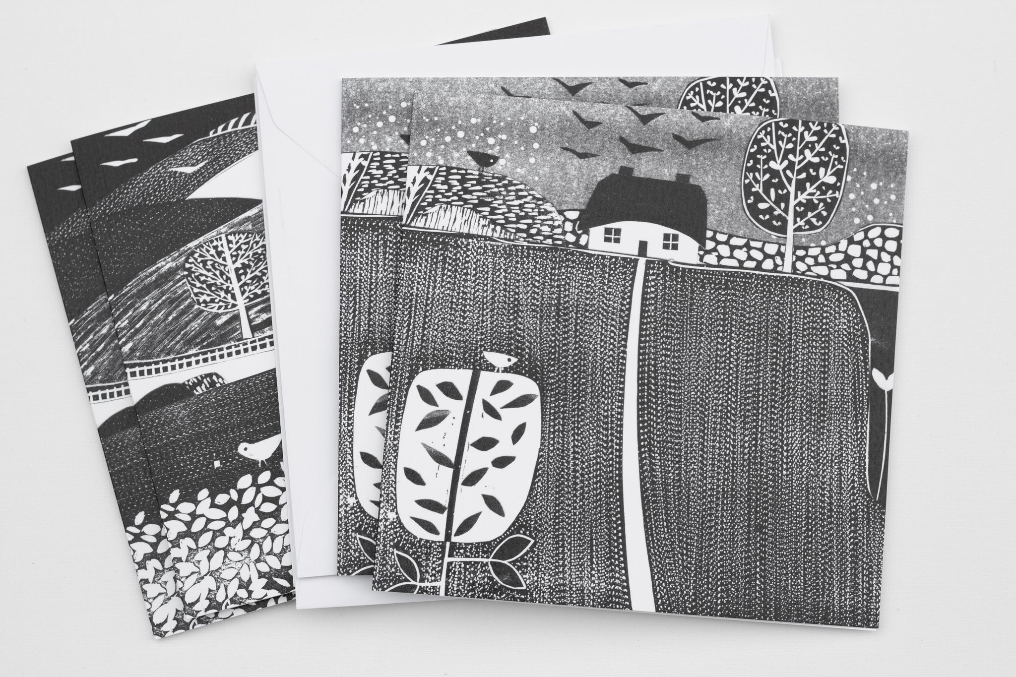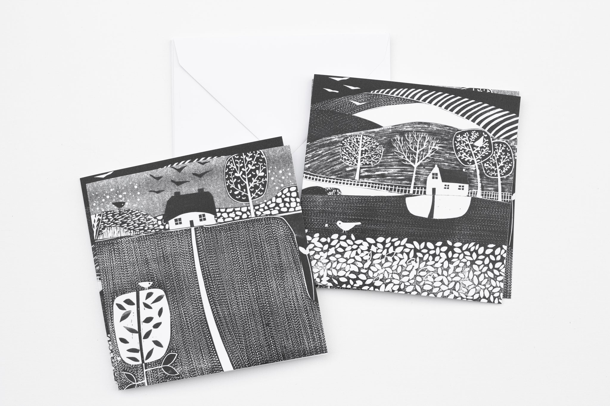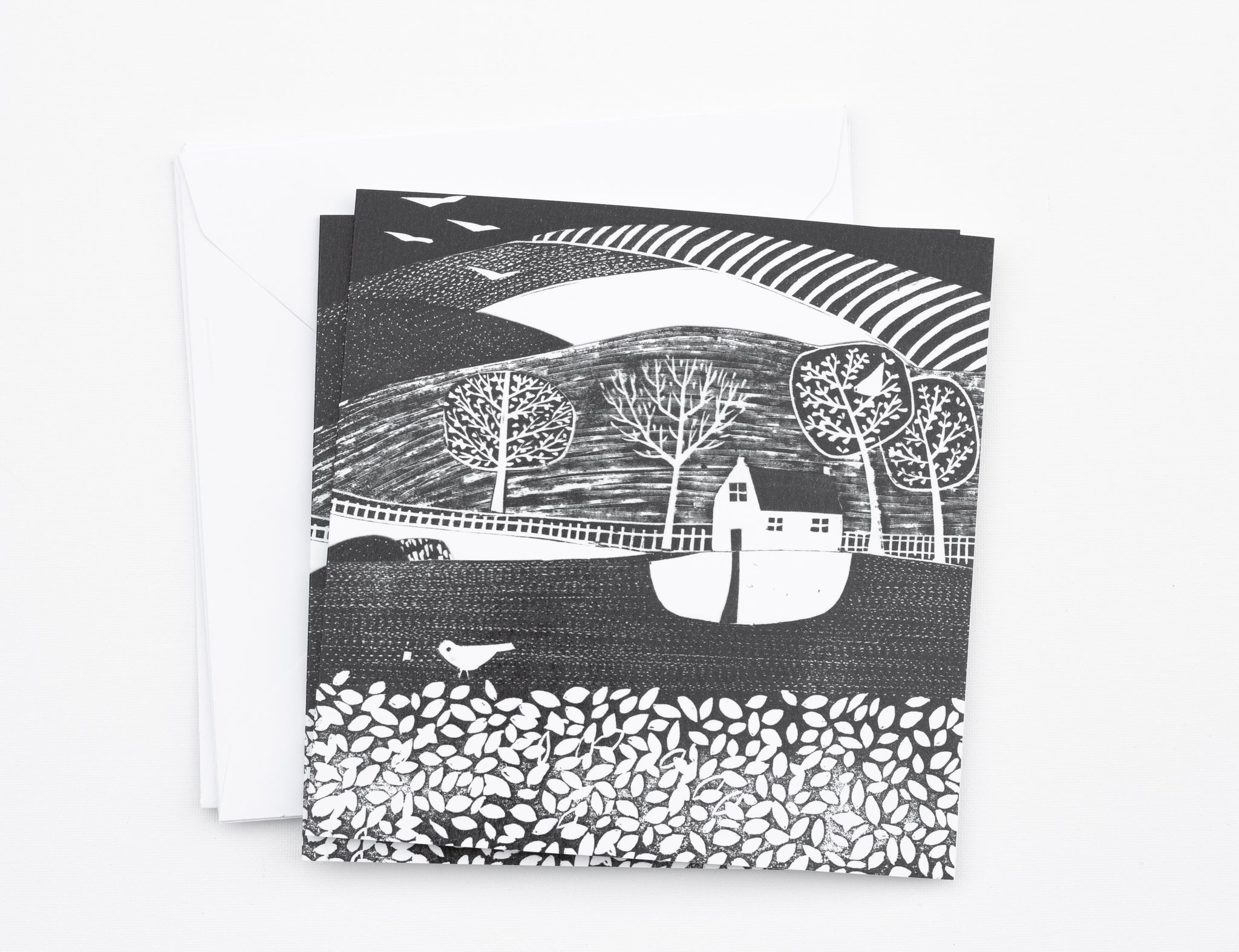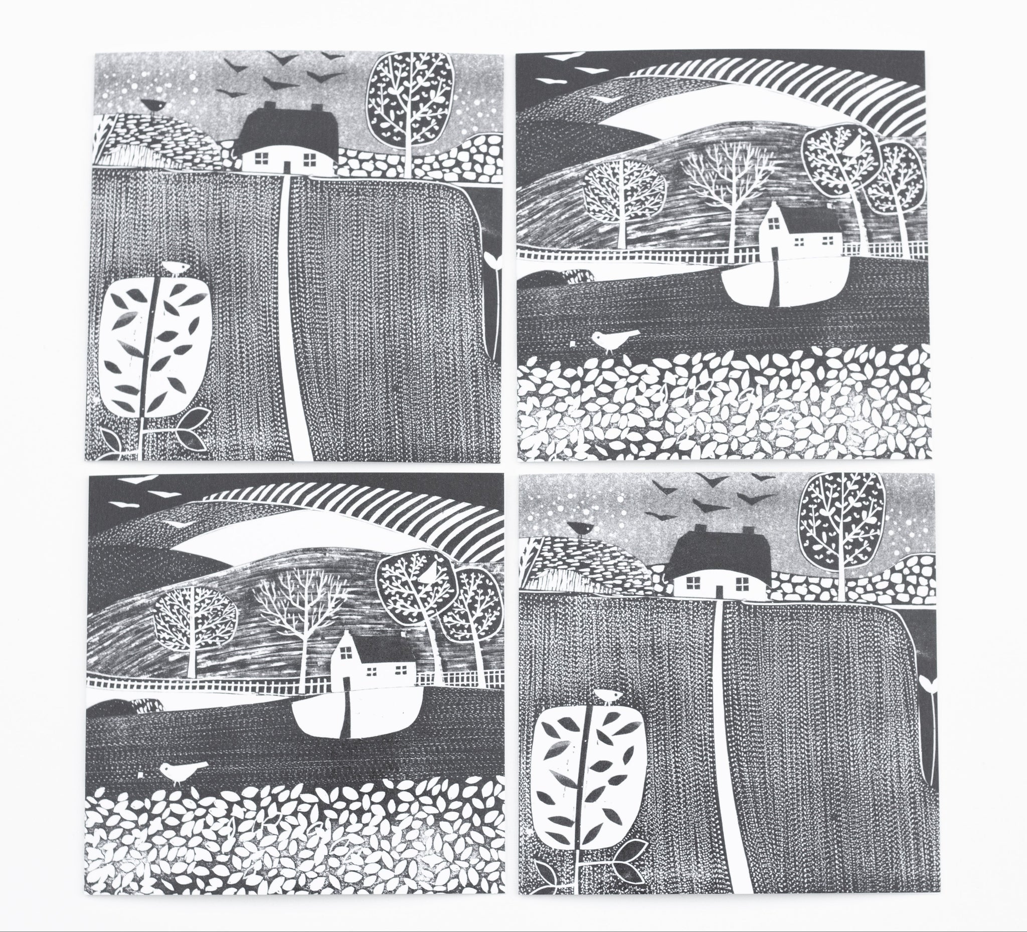 A set of four art cards featuring my original linocut collages, each capturing a peaceful countryside moment in black and white. Printed on smooth, high-quality card and blank inside, they’re perfect for sending a thoughtful note or framing as mini prints.