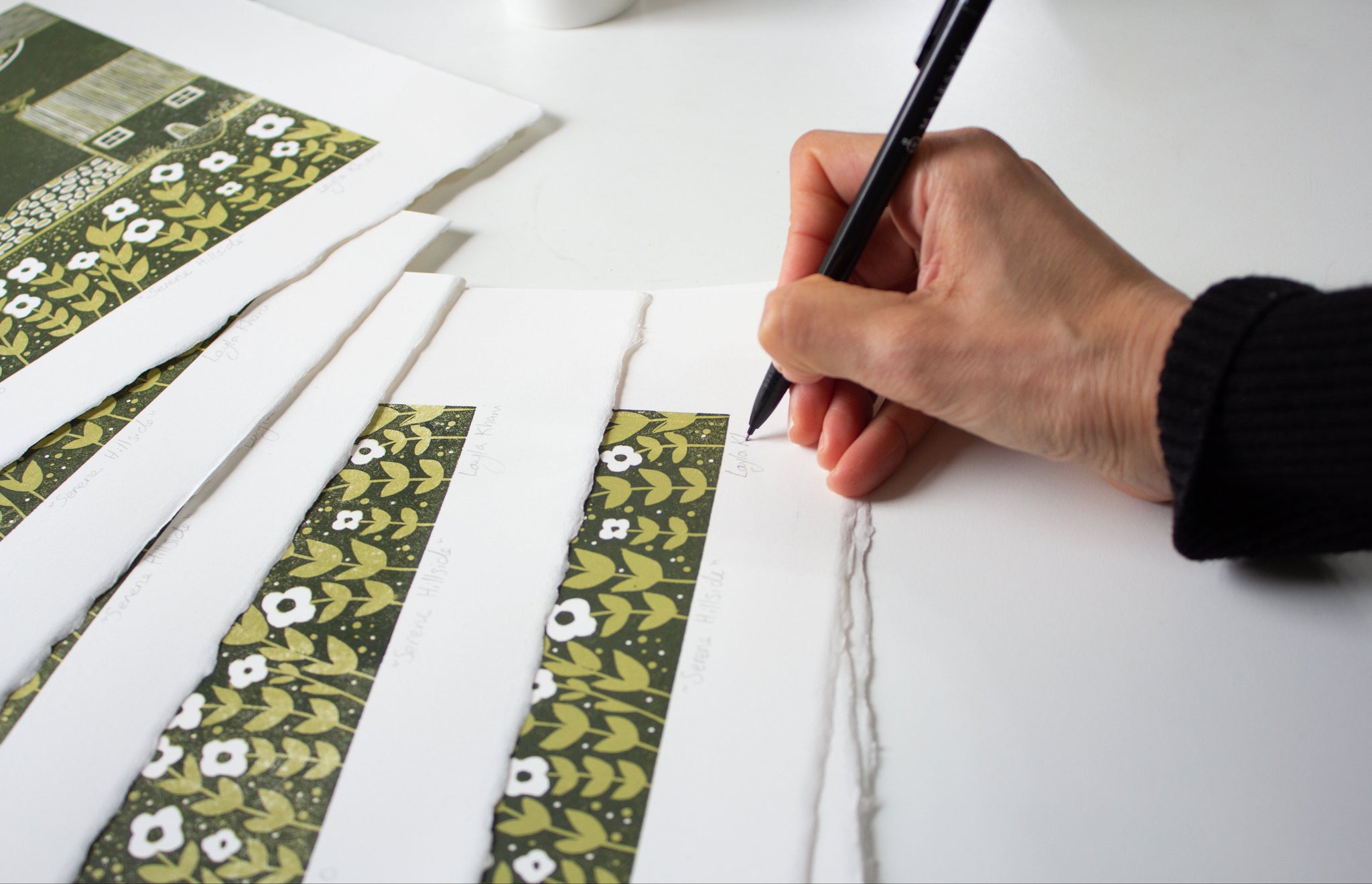 Each print is hand pulled, signed, and numbered, with the slight variations that make reduction linocuts feel so alive on the paper.