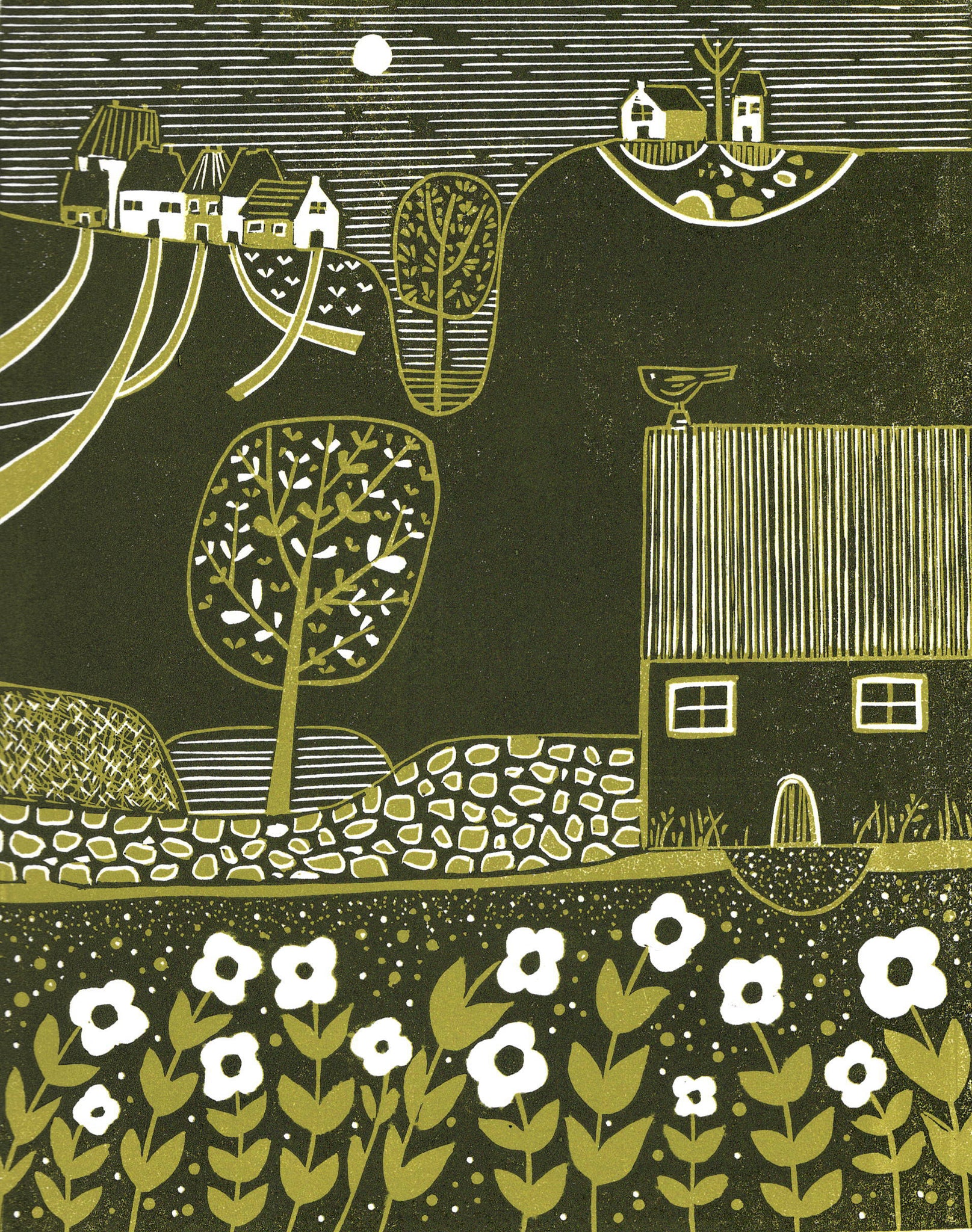 Serene Hillside is a two colour reduction linocut print, 16.5 x 20 cm, made in an edition of 20. I carved and printed it in stages, letting the shapes of the hills, the little houses, and the patterned fields build slowly over each layer.
