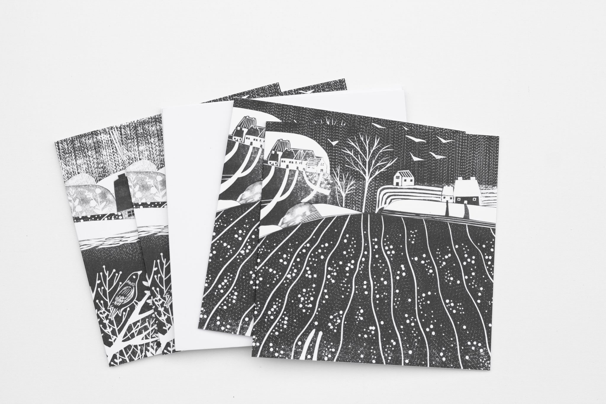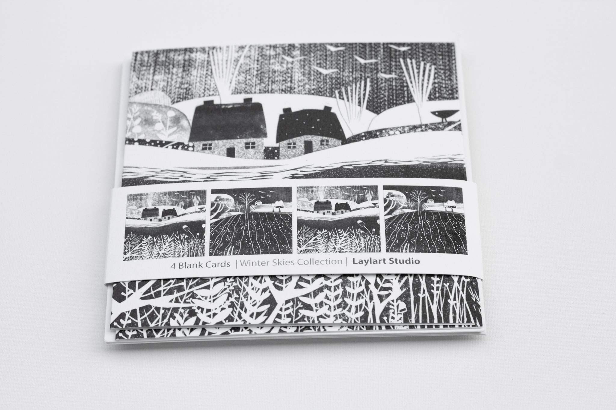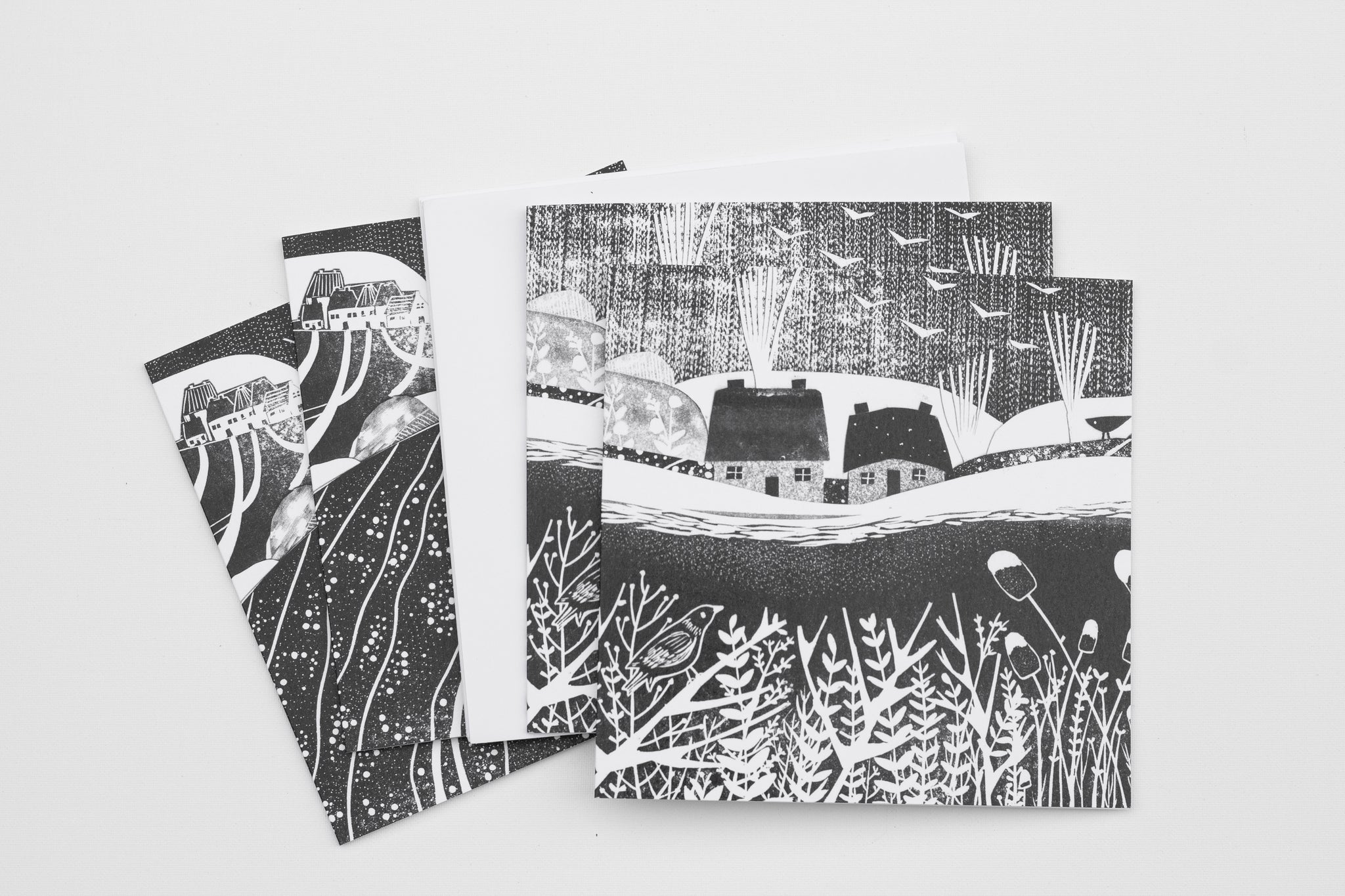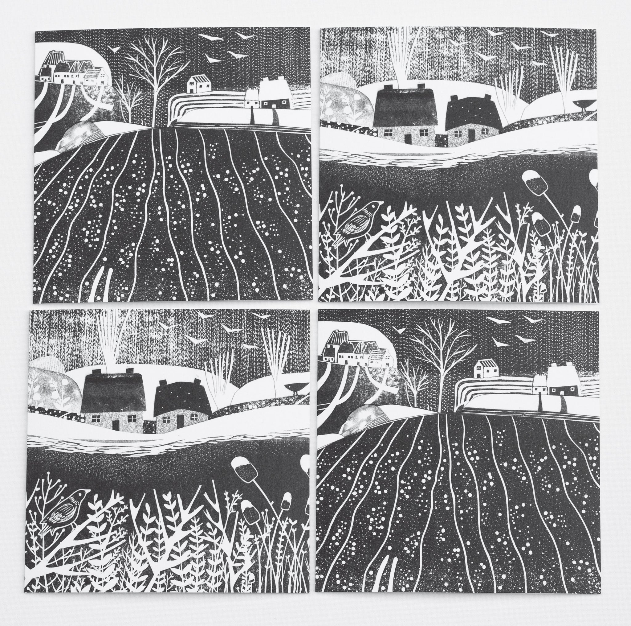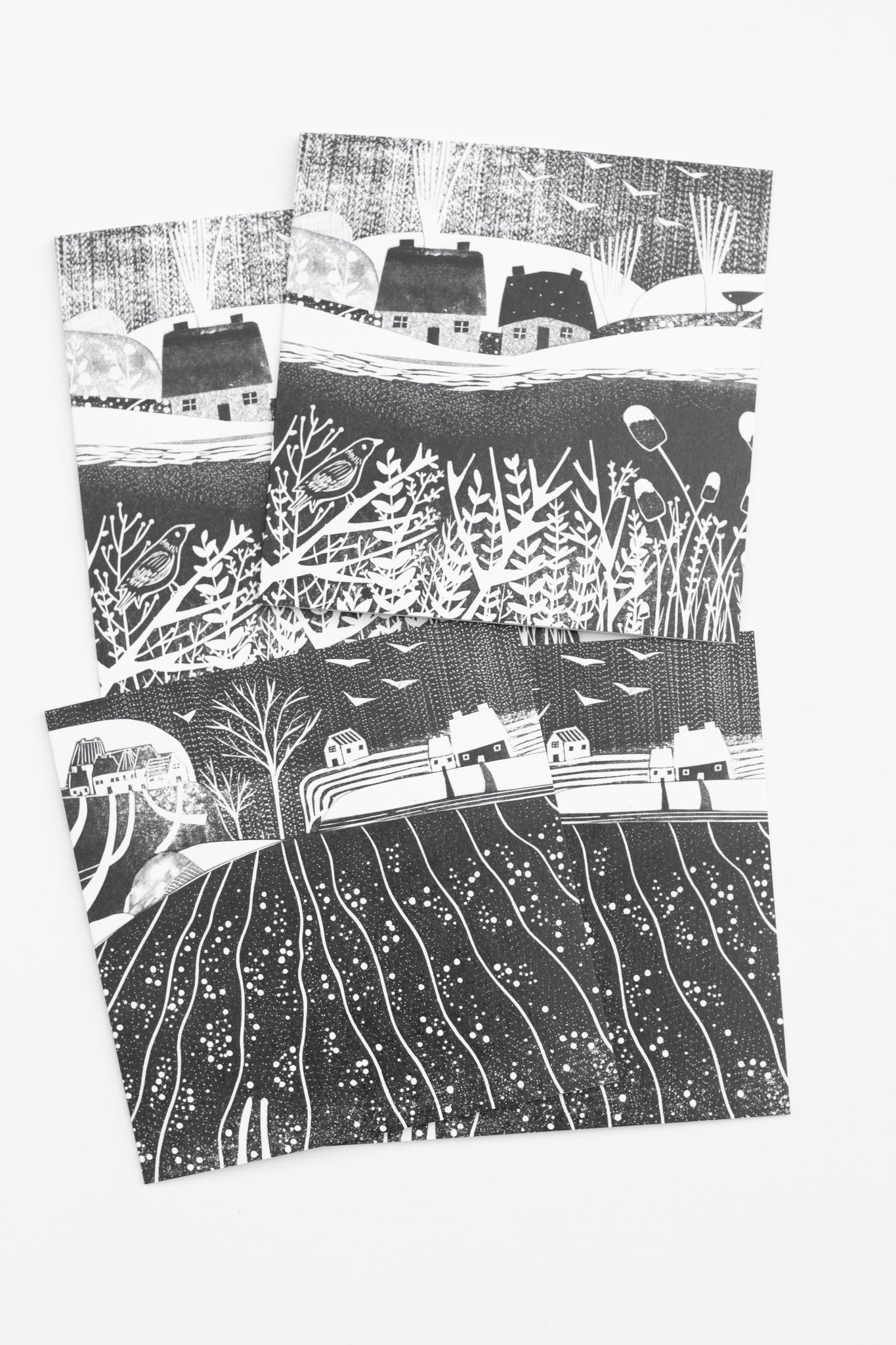 A set of four black and white art cards inspired by quiet winter landscapes and starlit skies. Each design comes from my original linocut collages, capturing cottages, trees, and wide open fields under falling snow. Printed on smooth, high-quality card and blank inside, they’re perfect for thoughtful winter notes or framing as mini prints.
